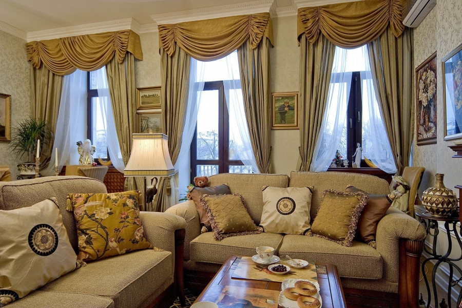 Классические шторы идеально подходят для гостиной, которая, как правило, является центральным местом в доме. В этом случае рекомендуется приобретать портьеры сдержанного дизайна, но с изысканным декором, чтобы создать максимально уютную атмосферу как для отдыха семьи, так и для приема гостей. обычно занавеси подбирают из плотного, тяжелого материала, который позволяет образовать складки. Неотъемлемой деталью вверху являются различные ламбрекены и прозрачная тюль. Шторы могут быть как очень длинными, ложащамися на пол, так и слегка укороченными. По бокам они обязательно собраны лентами, разнообразными шнурами с кисточками или бахромой, а также декоративными зажимами. Для украшения гардин очень часто используют бусины и вышивку позолоченной нитью. Чтобы подчеркнуть изящество портьер, образующих красивую драпировку, ткань должна быть плотной. Здесь предпочтение отдается натуральному шелку, хлопку, льну, а также искусственным вельвету, бархату, жаккарду, парче. Для тюля подбирают обычно легкую и прозрачную ткань белого или бежевого цвета. Можно использовать вуаль. Вверху тюль собирают в равномерные складки. Если гостиная вцелом имеет светлые тона, то могут подойти гардины немного ярче основного цвета с легким рисунком. И наоборот, в помещениях, оформленных в более сдержанных оттенках, лучше повесить более яркие портьеры.